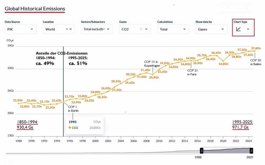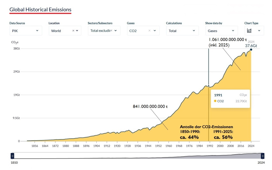 Der von Jahr zu Jahr stärker spürbare Klimawandel ist deshalb weniger das Ergebnis einer langen historischen Entwicklung seit Beginn des Industriezeitalters, sondern er beruht hauptsächlich auf den globalen CO2-Emissionen aus der Zeit nach 1990.