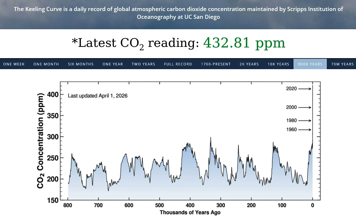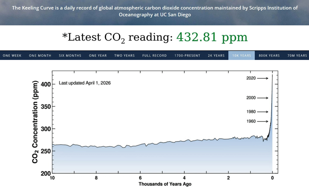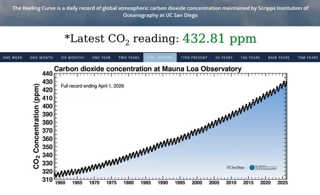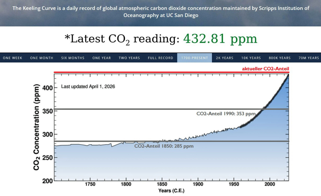 Nach 1990 nahm der CO2-Anstieg dann richtig Tempo auf und erreichte 428 ppm zu Jahresbeginn 2026 – ein Plus von 75 ppm.